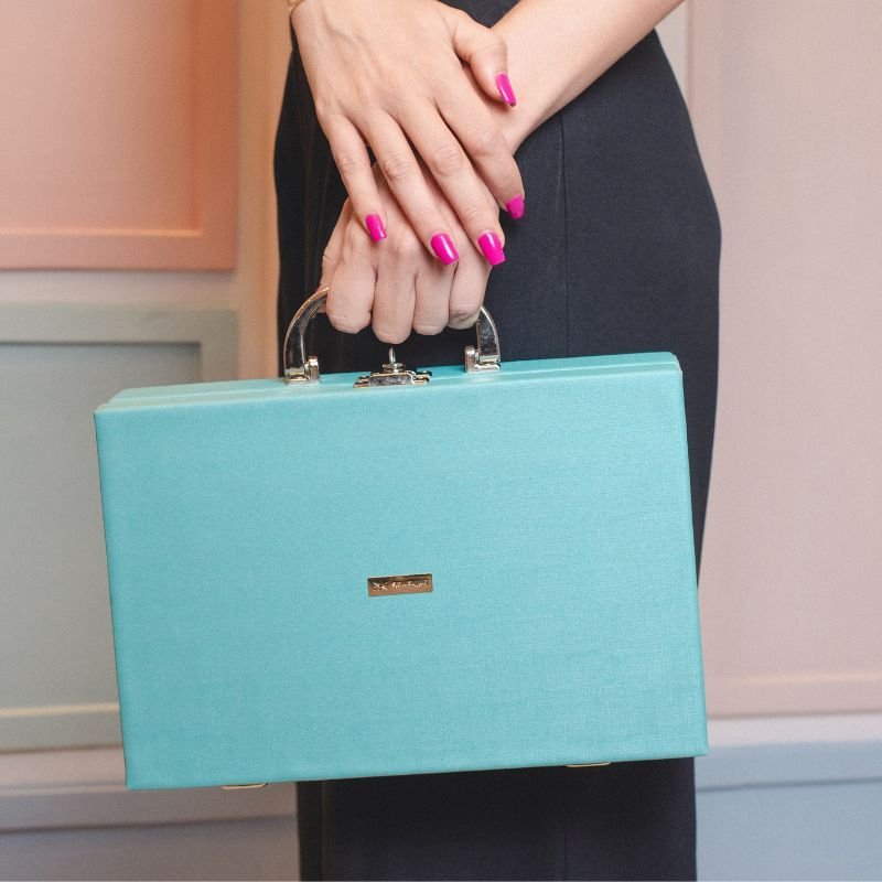 Com design elegante em tom turquesa premium, acabamento resistente e alça metĂĄlica de alta qualidade, essa maleta Ă© perfeita para quem deseja transportar suas peças com segurança e profissionalismo â seja para atendimento a clientes, eventos ou uso pessoal.